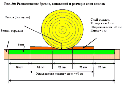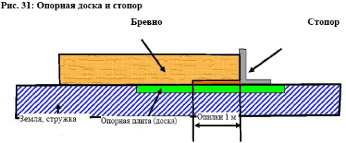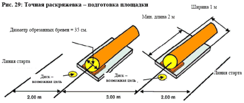 VIII. ВЫПОЛНЕНИЕ УПРАЖНЕНИЙ4. Точная раскряжевка4.1 Общая информация: Участник должен отрезать по диску от двух бревен, не повредив настил, на котором лежит бревно. Толщина диска – от 3 до 8 см. Диск отрезается под прямым углом к продольной оси бревна (рис. 28). 4.2 Подготовка площадки Уложить и закрепить два бревна с обрезанными торцами (диаметр без коры 35 см) горизонтально, параллельно друг другу на двух основаниях из досок. Основания шириной 1 метр и длиной не менее 3 метров заглублены до уровня земли. Расстояние между бревнами – 3 метра. Бревна лежат прямо на досках (рис. 29-30). Провести линию старта слева и справа от бревен на расстоянии 2 метров от центра соответствующего бревна. Участник может выбрать, с какой стороны ему начинать – слева или справа. ![]() У торца бревна кладут деревянный диск, на который участник может поставить пилу, чтобы остановить цепь перед переходом к другому бревну (рис. 29). Основания бревен покрыты слоем мокрых опилок толщиной 3 см, шириной 20 см и длиной 1 м (рис. 30 + 31). ![]() Доски утоплены до уровня земли. Также можно положить доски на землю и засыпать стружкой. Ограничитель массой 10 кг устанавливается на торце ствола, чтобы участник не мог отломить диск поворотом шины, пока диск не будет полностью отрезан (рис. 31). ![]() Если торец бревна обрезан с отклонением от перпендикуляра к продольной оси более 2°, участник имеет право потребовать, чтобы торец обрезали ровно. 4.3 Подготовка к упражнению Перед началом упражнения нужно: