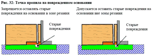 Запрещается выполнять упражнение, если на основании в зоне реза есть старые повреждения. То есть, если нельзя сдвинуть бревно так, чтобы участник не попал на старые повреждения (рис. 32). ![]() 4.4 Начало и конец упражнения Упражнение начинается по команде судьи и заканчивается, когда участник остановит цепь на специально подготовленном диске или поставит пилу на этот диск. 4.5 Оценка выполнения Все измерения пишут на отрезанном диске. Оценивают следующие параметры: Неправильно установлены цепь или пильный аппарат: Если цепь окажется зажатой в распиле или соскочит с шины, или упадет крепежная гайка зажимной крышки, участник может переустановить цепь и продолжить упражнение. Однако при этом баллы участника за упражнение «замена цепи» изменяются на 0 и участник не получает баллов за время выполнения упражнения «точная раскряжевка». Все остальные измерения, выполненные после установки цепи и завершения упражнения, оценивают как обычно. Мощность пилы: Баллы за время начисляют в соответствии с объемом двигателя. Пилы делятся на следующие группы: Группа 1: 46 – 55 см3 Намеренное удаление опилок: Если участник намеренно удалит опилки рукой, ногой или пилой (например, сдует или отбросит, резко увеличив скорость), он получает 0 баллов за это упражнение. За успешное выполнение этого упражнения начисляются следующие баллы:
