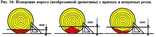 Точность пропила: Если участник отрежет по целому диску от двух бревен, не повредив цепью настил, на котором лежит бревно, то за каждое бревно начисляют 80 баллов. Но если цепь повредит настил, участник не получает баллы за точность резания. Ту часть бревна, которая не была обрезана, измеряют под прямым углом к настилу в самой высокой точке (рис. 34). Измеренное с точностью до 0,1 мм значение округляют до ближайшего целого мм в большую или меньшую сторону (таблица 14). ![]() Таблица 14: Баллы за точность раскряжевки